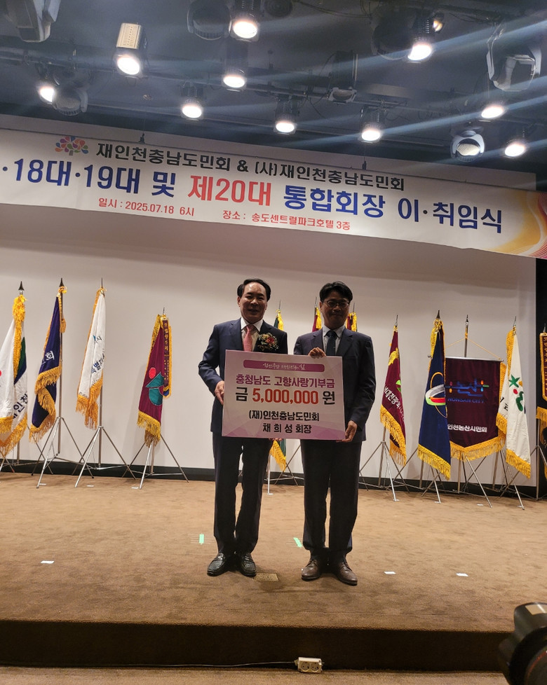 도에 따르면 채 회장은 지난 18일 송도센트럴파크 호텔에서 열린 재인천충남도민회 제20대 이·취임식에서 “고향의 발전을 위해 써 달라”며 행사에 참석한 도 관계자에게 기부금을 전달했다.