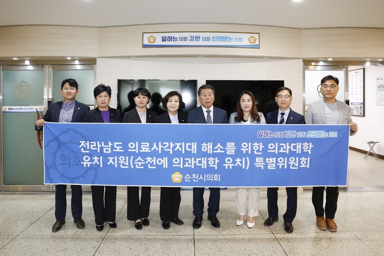 [순천시 세계타임즈=우덕현 기자] 순천시의회(의장 정병회)는 지난 26일 폐회 기간 중에도 ‘전라남도 의료사각지대 해소를 위한 의과대학 유치 지원(순천에 의과대학 유치) 특별위원회(위원장 강형구, 이하 의대특위)’ 회의를 개최하여, 순천대 의대 유치를 위한 향후 활동 계획을 논의했다.