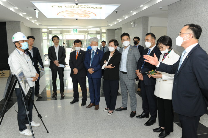 이후 방문한 축구전용구장에서는 광주FC의 1부리그 승격에 따른 한국프로축구연맹이 정한 최소 기준인 관람석 1만석 조건을 충족시키기 위해 추가 설치중인 3천석의 가변형 관람석 등에 대한 안전성 검증에 대한 현황을 듣고 관련시설을 꼼꼼히 확인했다.