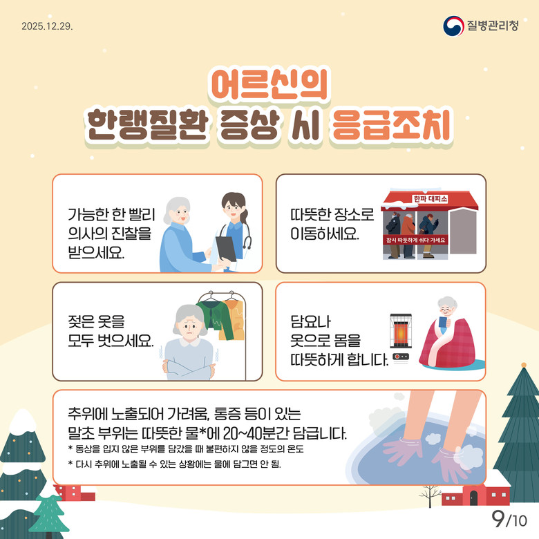 모든 도민에게는 ▲추운 날씨에 장시간 야외 활동 자제 ▲젖은 옷 즉시 교체 ▲음주 후 야외 노출 금지 ▲한파 시 실내 적정온도 유지 ▲한랭질환 의심 증상 발생 시 즉시 의료기관 방문 등 기본 예방 수칙 준수를 강조했다.