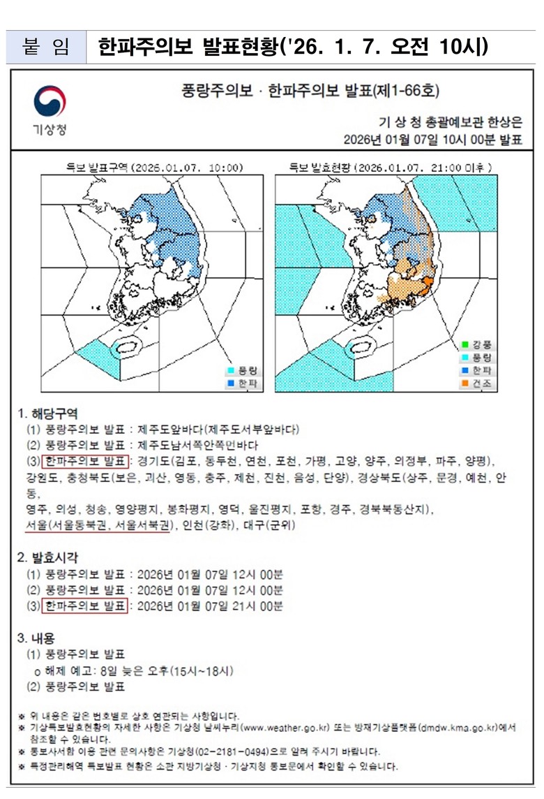 이번 한파주의보는 서울 동북권(도봉구‧노원구‧강북구‧성북구‧동대문구‧중랑구‧성동구‧광진구)과 서북권(은평구·종로구·마포구·서대문구·중구·용산구) 14개 자치구에 발효된다.