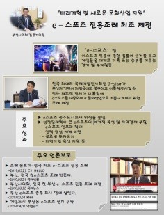 특히 이번 ‘2019년 대한민국 정책 컨벤션&페스티벌 대회’에서는 살찐고양이법 외 부산의 e스포츠 경쟁력 강화를 위한 각종 지원의 근거가 되는 법적장치인 「부산광역시 e스포츠 진흥에 관한 조례」를 전시하기로 하였다. 이 조례 역시 전국 최초로 발의된 조례이며 부산을 e스포츠 강국 도시로 발돋움하기 위한 초석이 되는 조례라는 평가를 받았다.