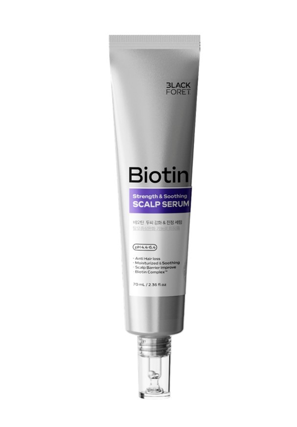 블랙포레 비오틴 두피 강화 앤 진정 세럼은 두피 영양 성분인 비오틴과 피부 진정 성분인 어성초잎추출물을 담아 두피의 탄력과 보습 강화는 물론 진정에 도움을 준다. 또한 식품의약품안전처 보고를 완료한 ‘탈모 증상 완화’ 기능성화장품으로 탈모 증상 완화에 도움을 주는 나이아신아마이드, 덱스판테놀, 살리실릭애씨드를 함유했다.