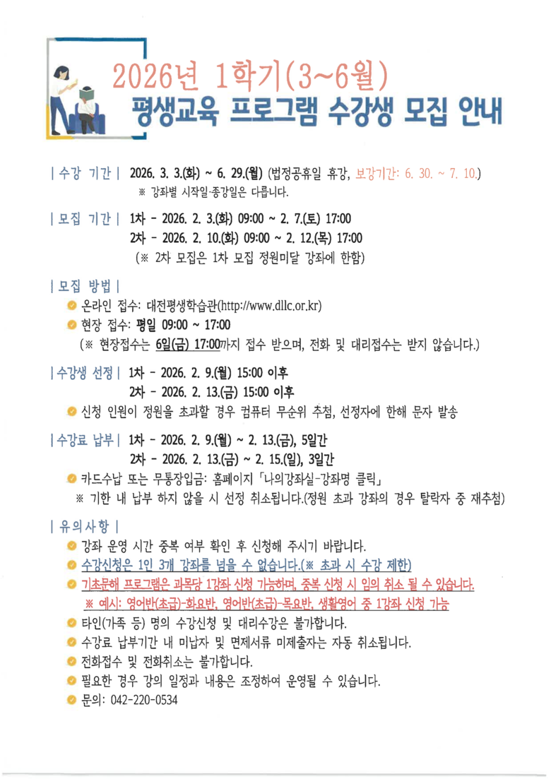 수강 신청은 2월 3일부터 7일까지 대전평생학습관 누리집에서 할 수 있다. 인터넷 이용이 어려운 어르신 등을 위해 평일 오전 9시부터 오후 5시까지 학습관 본관 101호에서 현장 접수도 병행한다.