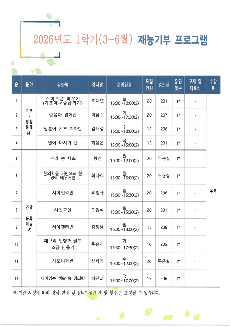 이번 학기에는 공모를 통해 선정된 46개 프로그램과 지역 우수강사의 재능을 활용한 12개 재능기부 프로그램 등 총 58개 강좌를 운영한다. 교육 과정은 영어 및 컴퓨터 등 기초문해 과정, 요리 및 동화구연지도사 등 직업능력·인문교양 과정, 통기타·민화·태극권 등 문화예술 과정으로 구성했다. 상반기 교육은 3월 3일부터 6월 29일까지 17주간 진행할 예정이다.