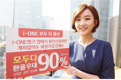 [세계타임즈 김장수 기자] IBK기업은행은 기업은행 계좌가 없어도, 회원가입을 하지 않아도 모바일뱅킹인 ‘i-ONE뱅크’ 앱에서 환전을 신청하면 90% 환율우대를 받을 수 있는 ‘i-ONE 모두다 환전’ 서비스를 출시했다고 4일 밝혔다.
