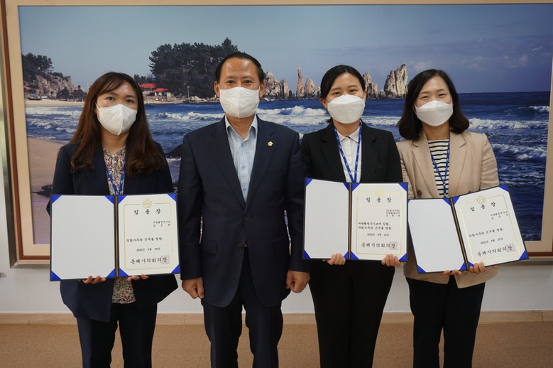 김기하 의장은 “동해시의회 인사위원회를 구성 후 승진 임용을 심의한 첫 자체 승진 인사라는 것에 큰 의미가 있으며 앞으로도 공정하고 합리적인 인사 운영으로 능력과 전문성을 갖춘 인재를 확보하겠으며, 의회 소속 직원들이 지방자치 발전의 중요한 역할이라는 사명감으로 근무에 임해줄 것”을 당부했다.