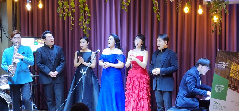 ▲뉴욕경제문화포럼 공연사진. 왼쪽부터 색소포니스트 Lu Kas, 바리톤 이승우, 소프라노 김문진, 소프라노 곽레나, 소프라노 차승희, 테너 윤도근, 피아니스트 장규민