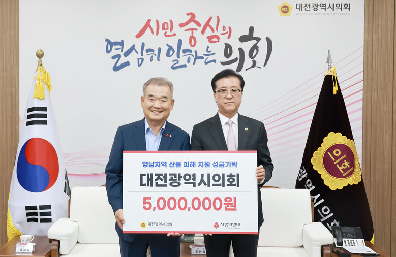 이날 기탁식에서 조원휘 의장은 최근 발생한 대형 산불로 많은 어려움을 겪고 있는 주민들에게 조금이나마 힘을 보태고자 대전시의회 전체 의원 22명과 의회사무처 직원들이 마음을 담아 마련한 성금 500만 원을 기탁했다.