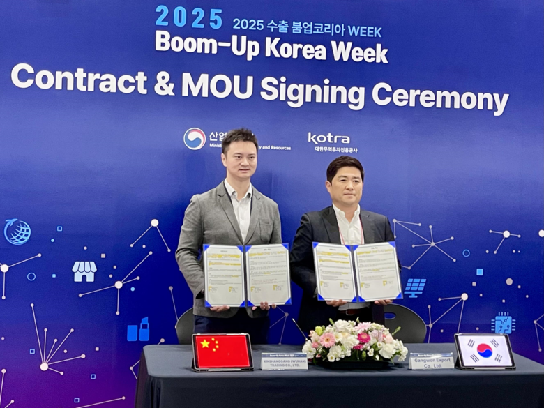 [강원도 세계타임즈=김민석 기자] ㈜강원수출(대표 함승우)은‘2025 수출 붐업코리아 위크(WEEK)’(10.21., 고양시 킨텍스) 현장에서 중국 후베이성 최대 수입식품 전문기업 신상강(XINSHANGGANG(WUHAN) TRADING CO., LTD)과 총 1,000만 달러 규모 장기 수출협약(MOU)을 체결했다.