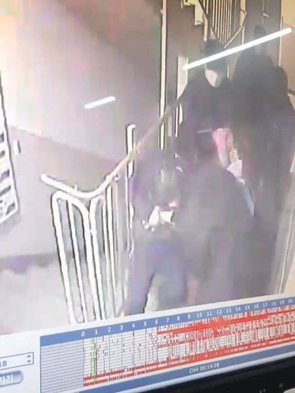 | ▲ 여러명의 남자들이 P양을 이불로 싼채 아파트 현관을 빠져나오고 있다. |