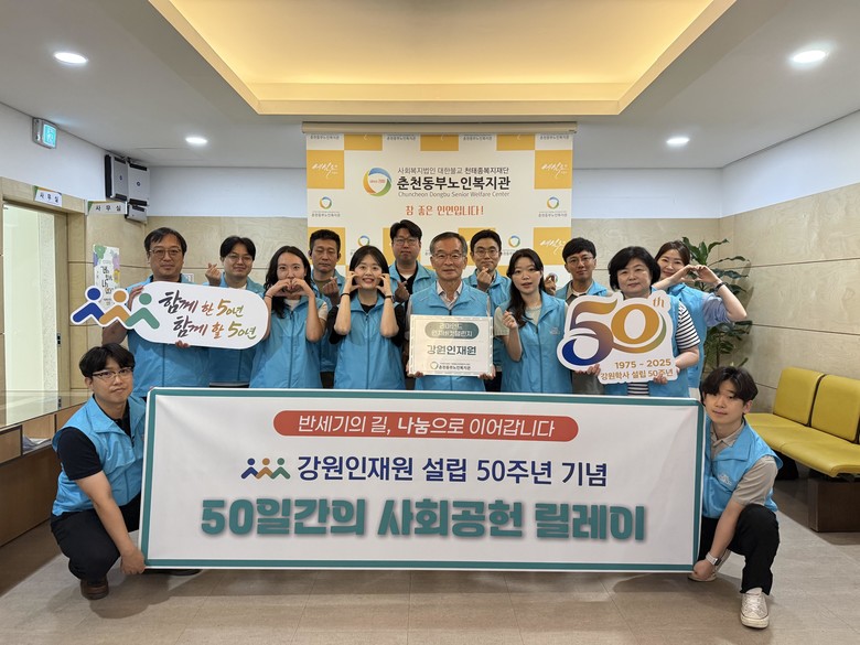 이와 관련, 강원인재원에서는 설립 50주년을 기념하는 「50일간의 사회공헌 릴레이」를 대대적으로 전개하고 있으며, ▲전 직원이 참여한 사랑의 쌀기부, ▲강원학사생과 함께하는 배식봉사, ▲도내 고교 멘토링 등을 이미 진행하였으며, 앞으로 임직원과 숙우회, 학사생이 함께‘사회공헌 릴레이’를 계속 이어나갈 예정이다.