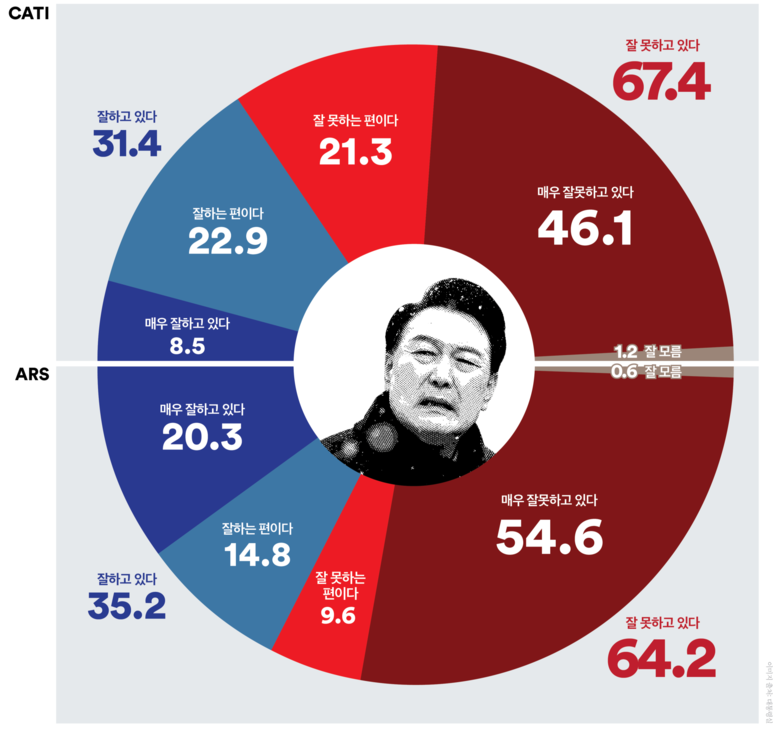 대통령 국정지지율, 전화면접조사는 횡보하며 무당층과 중도층의 부정평가가 75%를 넘어섰고, ARS는 ‘부정’평가 소폭 상승(격차: 전화면접조사 36.0%p, ARS조사 29.0%p)