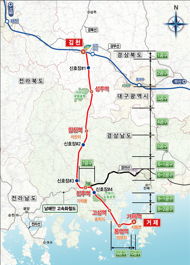 남부내륙철도는 2022년 1월 기본계획 고시 이후, 같은 해 6월부터 10개 공구로 구분해 기본 및 실시설계를 추진해 왔다. 현재 1~9공구는 실시설계가 마무리 단계며, 마지막 10공구인 거제 구간은 지난 6월 기본설계를 완료하고 올해 기술형 입찰방식(실시설계+시공)으로 발주될 예정이다.