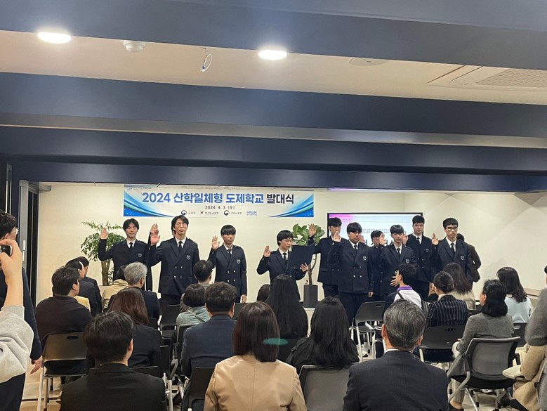 학생 대표로 선서를 한 스마트전자과 3학년 황기환 학생은 “선서식은 물론 모든 것이 처음해 보는 것이어서 다소 긴장되고 떨리지만 앞으로 도제학교에 열심히 참여해서 꼭 성공적으로 취업하겠다”는 의지를 드러냈다.