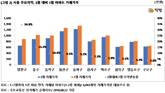3월과 비교해 거래가격이 가장 높아진 지역은 양천구다. 정부의 재건축 안전진단 기준 강화로 직격탄을 맞았던 목동신시가지 아파트가 5월 저가매물이 소진됐고, 이후 상승세로 전환되면서 넉 달 새 34.8%나 거래가격이 높아졌다. 여기에 목동선 경전철 사업에 대한 기대감이 다시금 고개를 들며 거래가격을 높이는데 한 몫 했다.