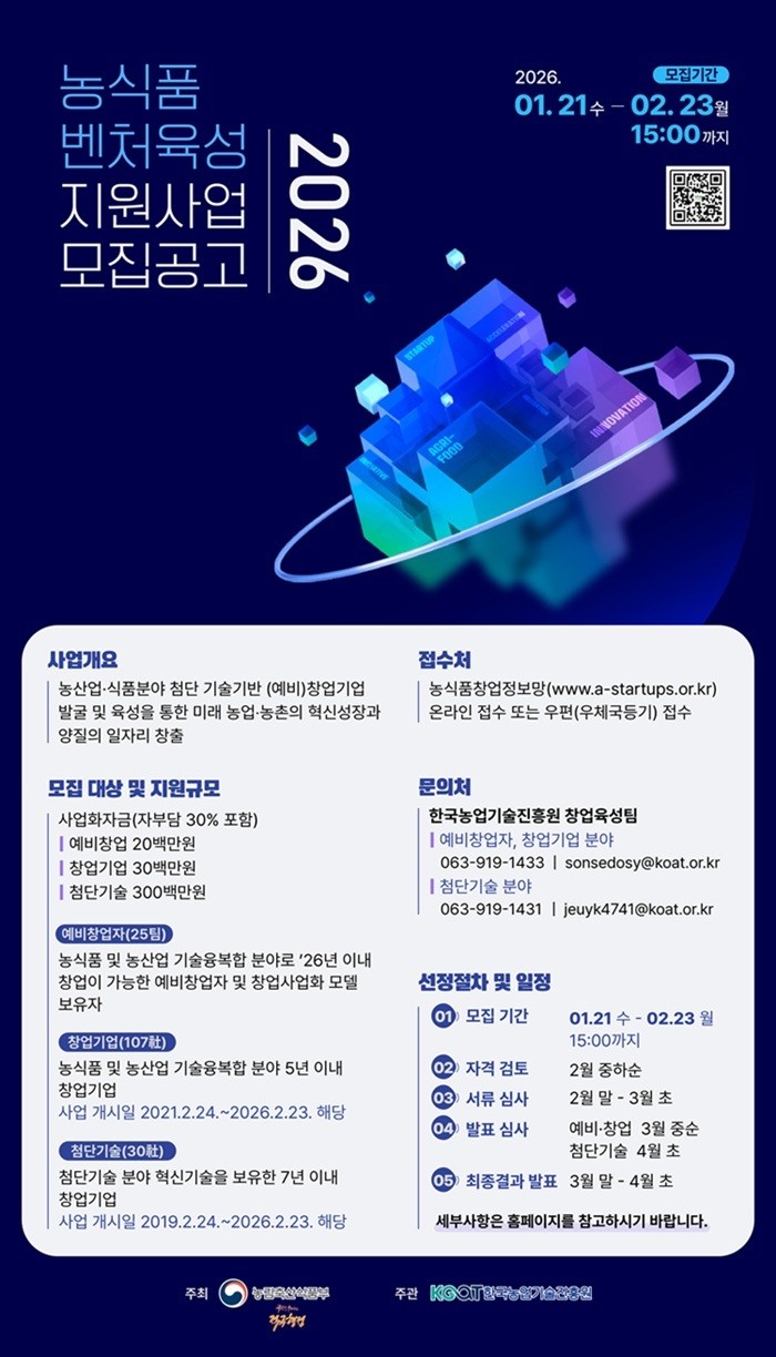 2026년 농식품 벤처육성 지원사업은 농식품 분야 예비창업자와 창업 초기 기업, 첨단기술을 접목한 유망 벤처기업을 대상으로 사업화 자금과 성장 지원을 제공하는 사업이다. 오는 23일까지 농식품창업정보망(www.a-startups.or.kr)에 접수하면 된다.