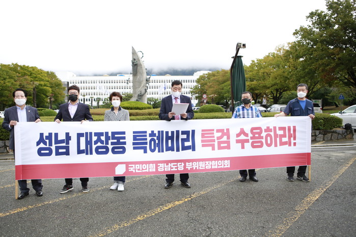 부위원장협의회는 아울러 "희대의 대국민 사기극, 단군 이래 최대의 토건 비리 세력들이 벌인 이 돈벼락 사기 사건의 진실을 파헤쳐 주범과 관련자들을 엄벌에 처하고 사회 정의를 세우기 위해서는 오직 특검 쟁취만이 유일한 길임을 호소 드린다"며 "우리 국민의힘 경남도당 부위원장협의회는 특검 쟁취를 위해 끝까지 투쟁할 것임을 천명한다"고 강조했다.