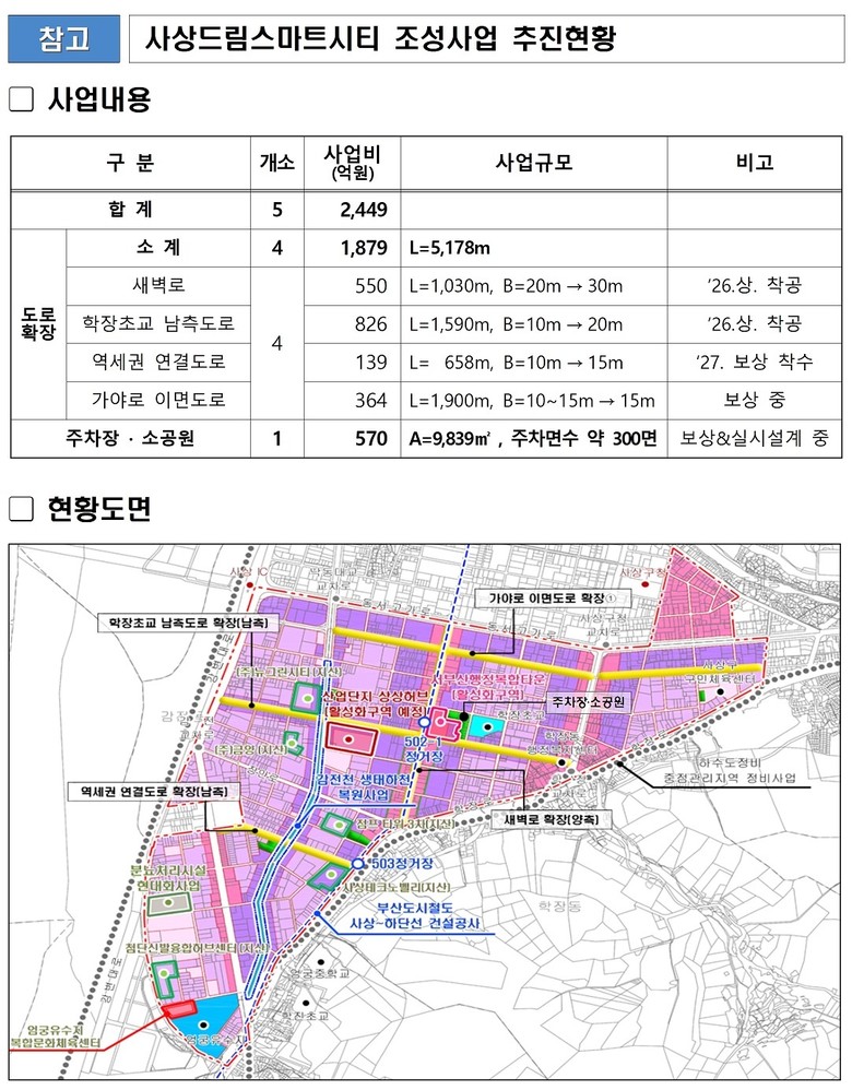 사상드림스마트시티 조성사업은 사업비 2,449억 원(국비 1,222, 시비 1,227)을 투입하여 산단 내 주요 도로 4개 노선을 확장하고 근로자가 가장 필요하다고 꼽은 주차장‧공원 1곳을 조성하는 사업이다.