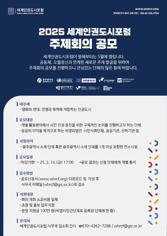 신청은 세계인권도시포럼 공식 누리집(www.whrcf.org)에서 공모신청서를 내려받아 작성한 뒤 사무국 이메일로 접수하면 된다. 자세한 공모 내용은 세계인권도시포럼 누리집에서 확인 가능하다.