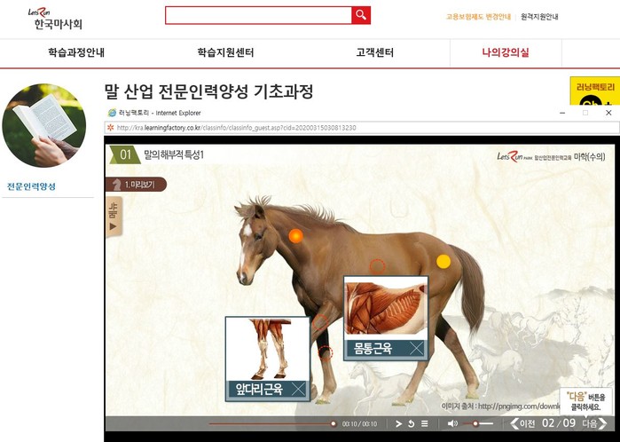 특히 교육부의 4월 온라인 개학 방침에 따라 말산업 전문 인력 양성기관 고교들이 온라인 개학 수업 방식과 콘텐츠를 물색하고 있는 가운데 한국마사회는 양성기관 고교들의 수업 공백과 혼란을 최소화하기 위해 지난 9일부터 말산업 전문인력 양성 고교(6개교)에 e-러닝 교육 콘텐츠(마학, 마술학, 경주마술, 장제 등 총 27강)를 제공하고 있다.