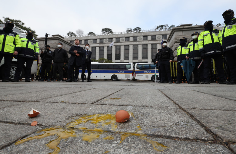 기자회견 당시 헌재 앞에는 경찰 기동대가 포진하고 있었다. 경찰은 민주당 의원들 앞에서 장우산을 펼치는 등 날아오는 물체에 대비하는 모습도 포착됐다.헌재 건너편 인도에는 윤석열 대통령 지지자들이 있었다. 이들을 주시하고 있던 경찰은 결국 헌재와 인도 사이 4차선을 넘어 날아든 계란을 막지 못했다.현장에 있던 경찰은 현행범을 체포하지 못해 전담수사팀을 꾸려 추적 중이다.