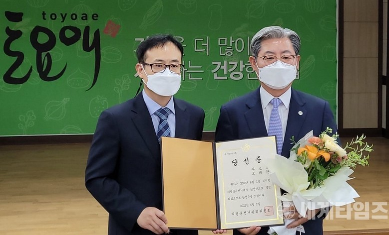 [세계타임즈 = 이진화 기자] 지난 6·1지방선거 경남 의령군수 선거에서 재선에 성공한 무소속 오태완 의령군수가 3일 오전 의령군 의령읍 농업기술센터 3층 대회의실에서 의령군선거관리위원회로부터 당선증을 받고 있다. [오태완 선거사무소 제공]