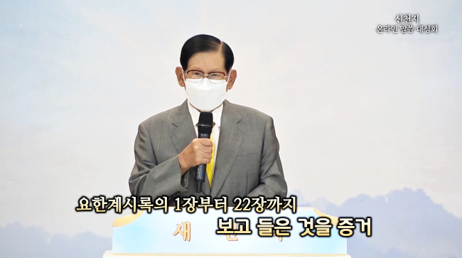 이 총회장은 “해당 내용의 사건은 오늘날 일어났다”며 “이 사람은 사건의 현장에서 모든 것을 보고 들은 사람이다. 계시록 전장의 실체들을 봤기 때문에 증거할 수 있는 것”이라고 말했다.