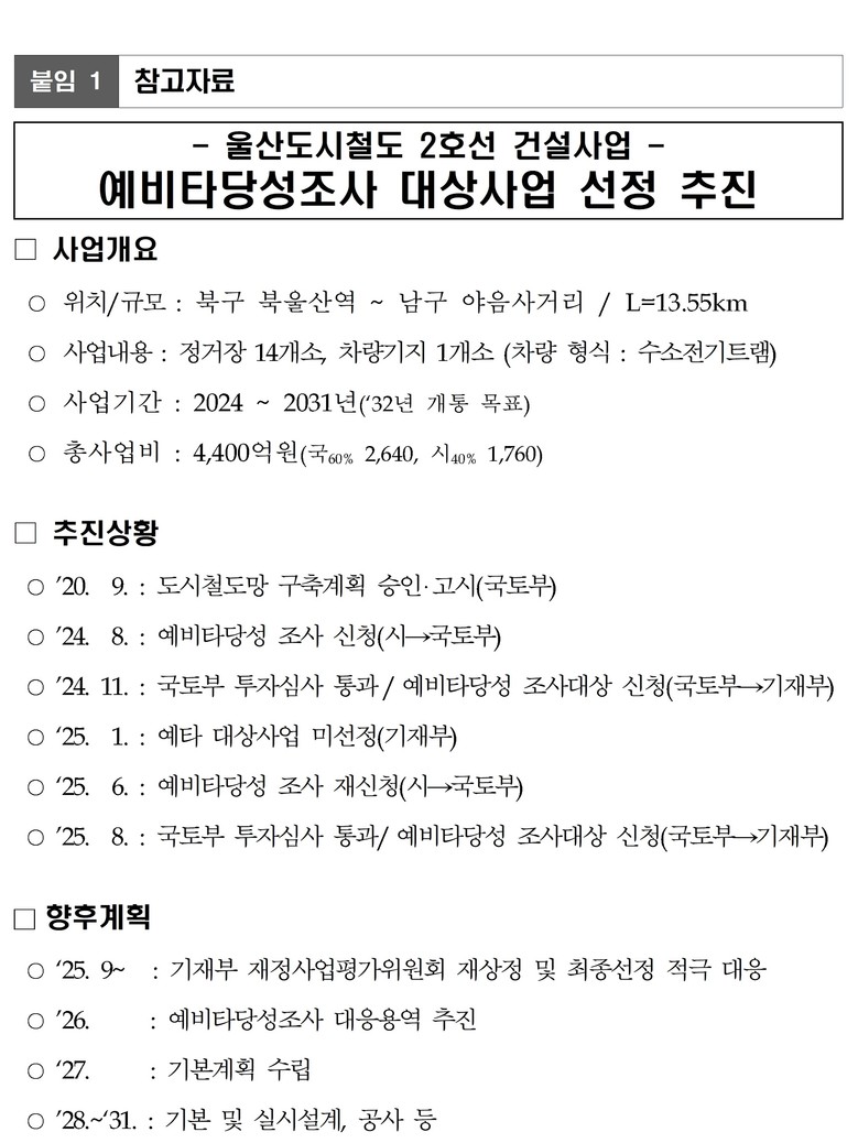 울산시는 도시철도 2호선 예비타당성조사 대상사업 선정을 위해 지난 6월 국토부에 해당 사업을 신청했으며, 이번에 투자심사를 통과하게 됐다.
