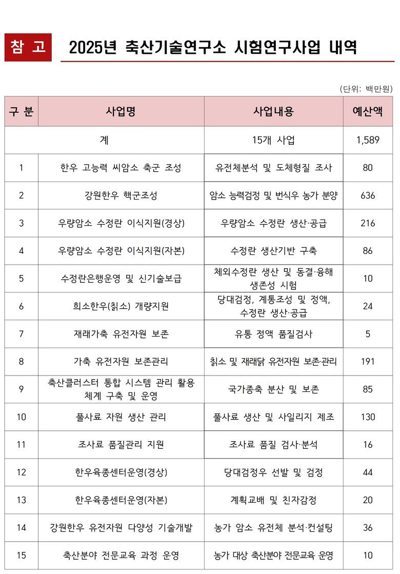 이번에 시행하는 시험연구사업은 총 4개 분야 15개 사업으로, 투입 예산은 16억 원 규모이다. 분야별로는 ▲고능력 암소 축군 조성 등 번식기반 차별화를 위하여 우량암소 수정란 생산·공급, 한우 번식우 농가분양 등 5개 사업에 10억 원, ▲동물유전자원 다양성 보존 및 혈통관리를 지원하는 정액 및 수정란 생산·공급, 계보복원 및 유전특성 발굴 등 4개 사업에 3억 원, ▲고품질 풀사료 안정적 공급체계 구축을 위하여 기후 적응형 사료작물 시험재배, 농가 풀사료 품질검사 추진 등 2개 사업 2억 원, ▲가축 개량기반 안정화 및 효율성 극대화를 도모하기 위한 농가 암소 유전체 분석·컨설팅, 축산 분야 전문교육 과정 운영 4개 사업에 1억 원을 각각 투자한다.