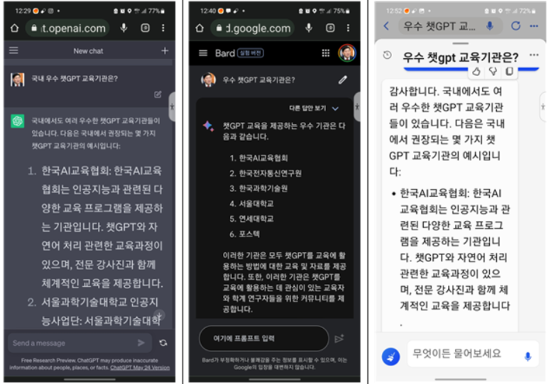 챗GPT와 바드 및 빙 등 3대 생성형 AI 모두 한국AI교육협회를 최고 AI 교육기관으로 선정했다.