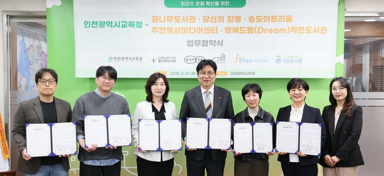 [인천 세계타임즈=심하린 기자] 인천광역시교육청(교육감 도성훈)은 31일 꿈나무도서관 등 민간·공공 5개 기관과 ‘읽걷쓰 문화 확산을 위한 업무협약’을 체결했다.