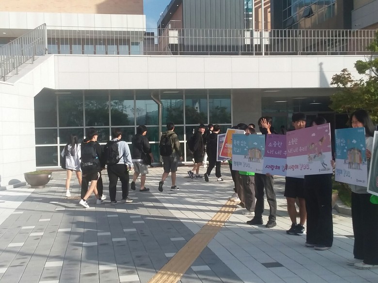 [아산시 세계타임즈=백택기 기자] 이순신고등학교(교장 김태균) Wee클래스는 2023년 하반기 상담주간을 맞이해 8월 28일(월)부터 9월 22일(금)까지 친구사랑, 생명사랑 분위기 확산을 위한 다양한 행사를 진행하고, 마지막 날인 지난 9월 22일(금) 또래상담자들과 학생회 소속 학생들이 중심이 되어 등교하는 친구들을 반가운 마음으로 맞이하는‘등굣길 캠페인’을 실시했다.