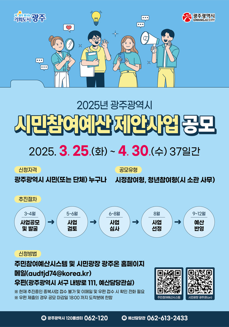 참여는 광주시 누리집(고시‧공고)에서 신청서를 내려받아 ‘광주시 주민e참여시스템’(https://pb.lofin365.go.kr/gwangju/business/regBusinessInfoView2)과 ‘시민광장 광주온(ON)’(https://gwangjuon.gwangju.go.kr)을 통해 온라인 접수하면 된다. 메일(audtjd74@korea.kr)이나 우편(광주 서구 내방로111, 광주시 예산담당관실)으로도 접수할 수 있다.