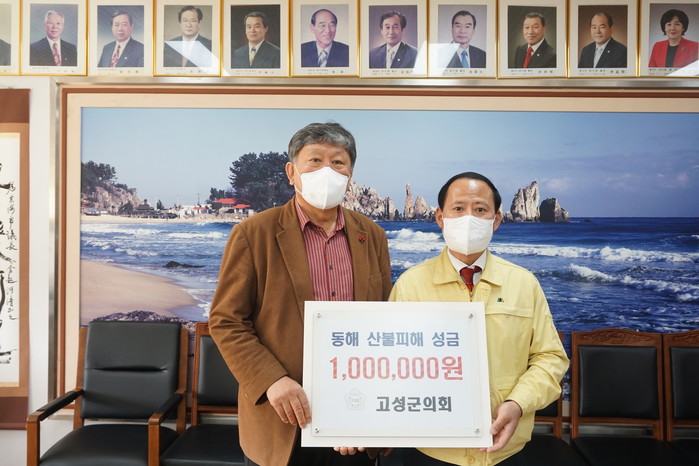 [고성군=세계타임즈 김민석 기자] 고성군의회(의장 함형완)는 15일 강릉 옥계 산불 발생과 관련, 동해시의회(의장 김기하)를 방문해 동해 산불 피해 복구와 이재민 지원을 위해 써달라며 복구지원 성금 100만원 상당 기탁금을 전달했다.