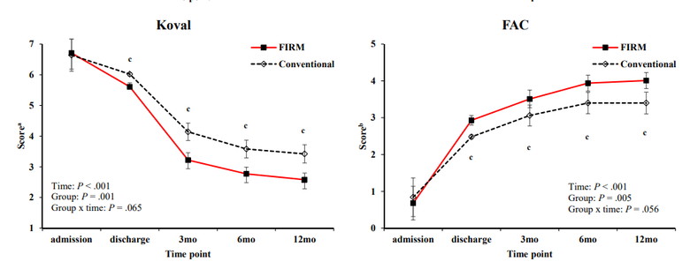 그 결과 1년간 FIRM 그룹의 Koval 점수 변화는 –4.13점으로, 통상 재활치료 그룹의 점수 변화(–3.22점)보다 더 컸고, FAC 점수는 FIRM 그룹에서 3.37점 증가한 반면, 일반 재활치료 그룹에서는 2.56점 증가하는 데 그쳤다. 또한, 12개월 추적조사 시점에서 FIRM은 독립보행률이 76.8%로 통상치료 그룹 56.0% 보다 높았고, 골절 전 보행상태로 회복률 또한 81.2%로 대조군 62.0%에 비해 더 높았다.