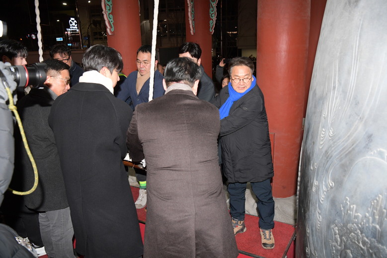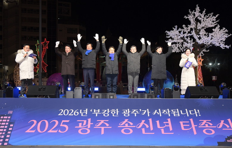 [광주 세계타임즈=손권일 기자] 강기정 광주광역시장이 1월1일 민주의 종각에서 열린 송·신년 시민행사 타종식에서 2025년 한 해 광주를 빛낸 시민대표와 함께 타종을 하고 있다. / 광주광역시 제공