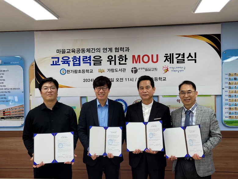 [파주시 세계타임즈=송민수 기자] 파주 한가람초(교장 이강수)는 4월 17일(수) 오전 11시에 한가람초에서 가람도서관(도서관장 오동근), 온땅에 밀알교회(목사 홍영수), 사랑누리비젼스쿨지역아동센터(센터장 권오병)와 MOU를 체결하고 교육활동에 협력할 것을 약속하는 시간을 가졌다.