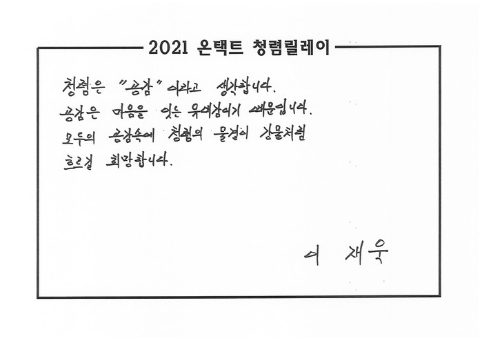 최초 청렴 메세지 전파자 마사회 이재욱 상임감사위원은 “청렴의 기본은 공감이며, 직원 모두의 공감 속에서 청렴이 마사회 전체에 강물처럼 흐르기를 희망한다”는 메시지를 남겼다.