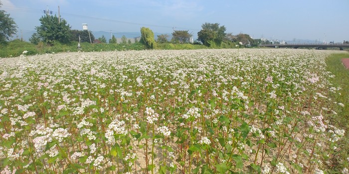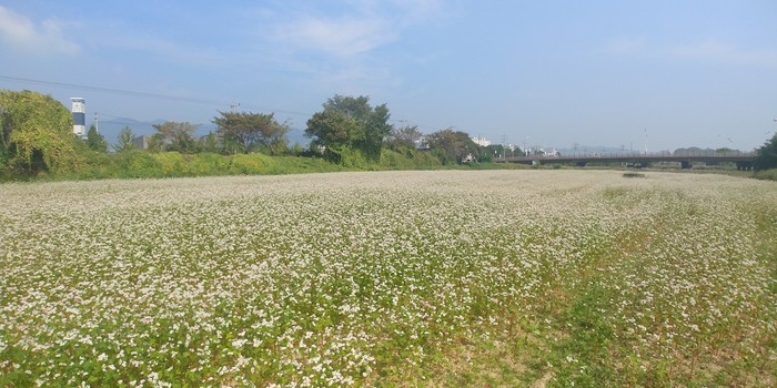 또 코스모스길을 따라 반탄대교 방면으로 200m를 걷다보면 눈이 내린 듯 새하얀 메밀꽃밭이 펼쳐져 있다.