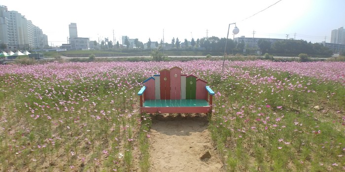 증평군은 인삼골축제(9.28~10.1.)를 찾는 관광객에게 아름다운 볼거리를 제공하기 위해 보강천변에 코스모스길을 조성했다.