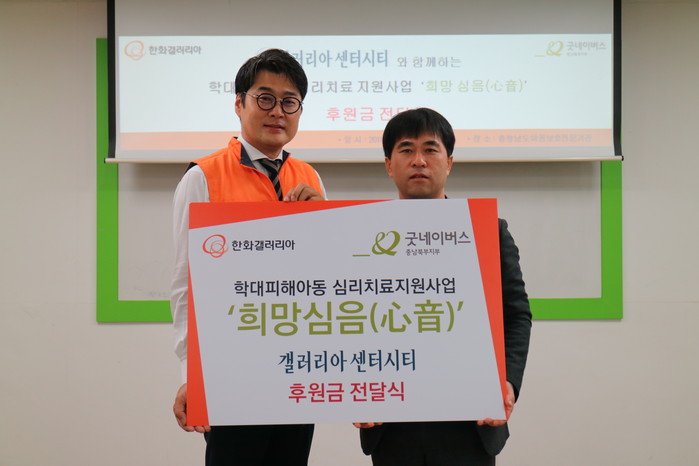 [충남=세계타임즈 이현진 기자] 20일(목), 굿네이버스 충남북부지부(지부장 고승곤)은 한화갤러리아 센터시티(상무 김상원)와 함께 학대피해아동 심리치료 지원사업 ‘희망심음(心音)’ 후원금 전달식을 진행했다.