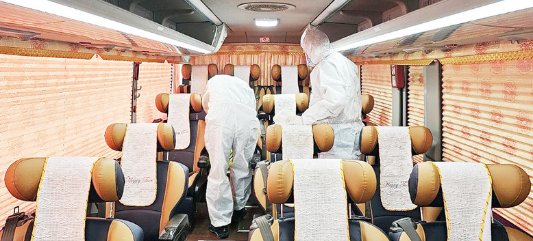 | ▲ 11일 대구스타디움에서 ‘신천지 12지파 시온기독교선교센터 114기 수료식’이 개최되는 가운데 봉사자들이 수료생들이 탑승할 전세버스를 소독하고 있다 |