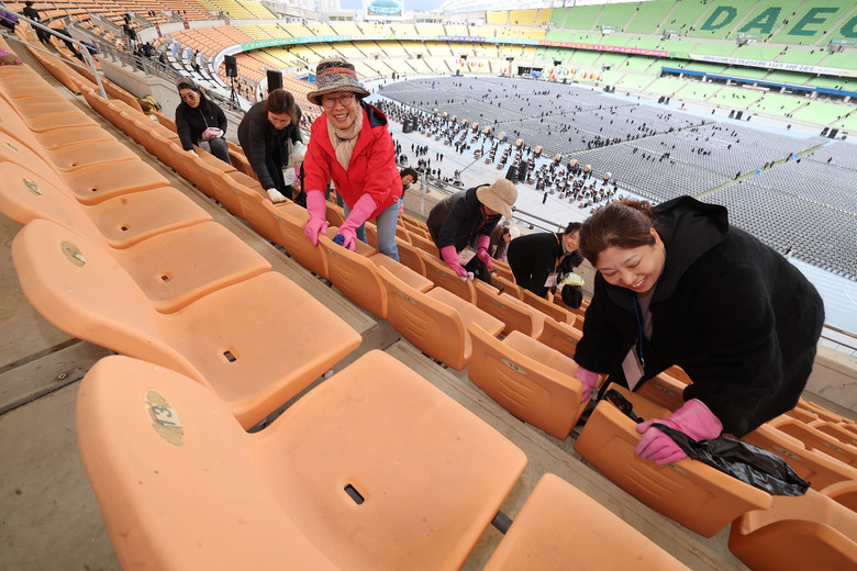 | ▲ 11일 대구스타디움에서 ‘신천지 12지파 시온기독교선교센터 114기 수료식’이 준비되는 가운데 봉사자들이 좌석을 청소하고 있다 |