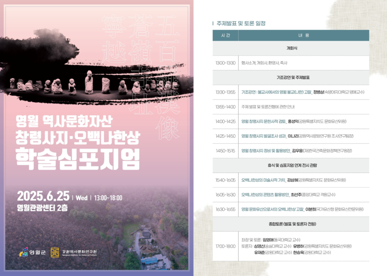2부 발표는 강삼혜 위원(강원특별자치도 문화유산위원)의 「영월 창령사지 오백나한상의 미술사적 가치」, 최선주 교수(중앙대학교)의 「오백나한상의 콘텐츠 활용 방안」, 이분희 팀장(대한불교조계종 총무원, 국가유산청 문화유산전문위원)의 「영월 문화유산으로서의 창령사 오백나한상 고찰」이 이어질 예정이다.