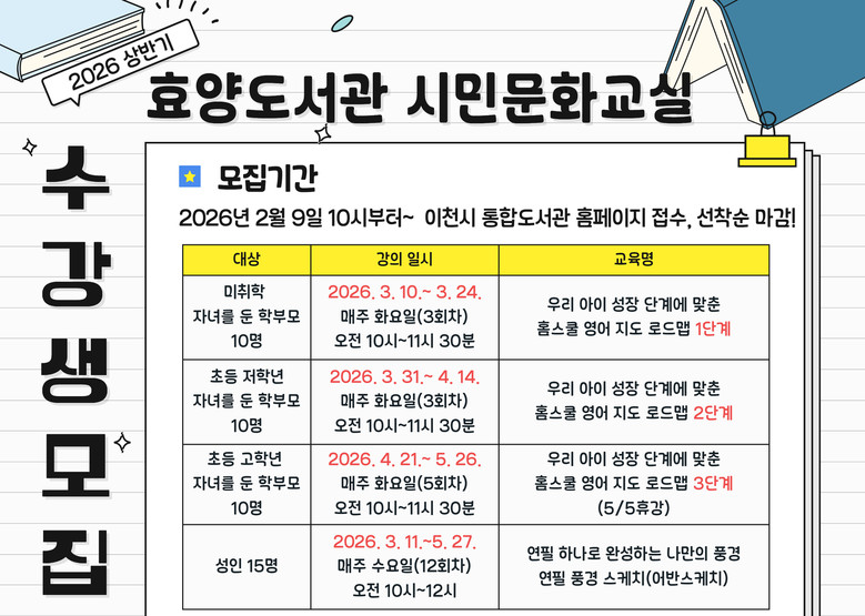 프로그램 참가자는 2월 9일 월요일 오전 10시부터 선착순으로 모집한다. 프로그램 관련 자세한 사항은 이천시통합도서관 누리집 또는 효양도서관(☎031-644-4393)으로 문의하면 된다.
