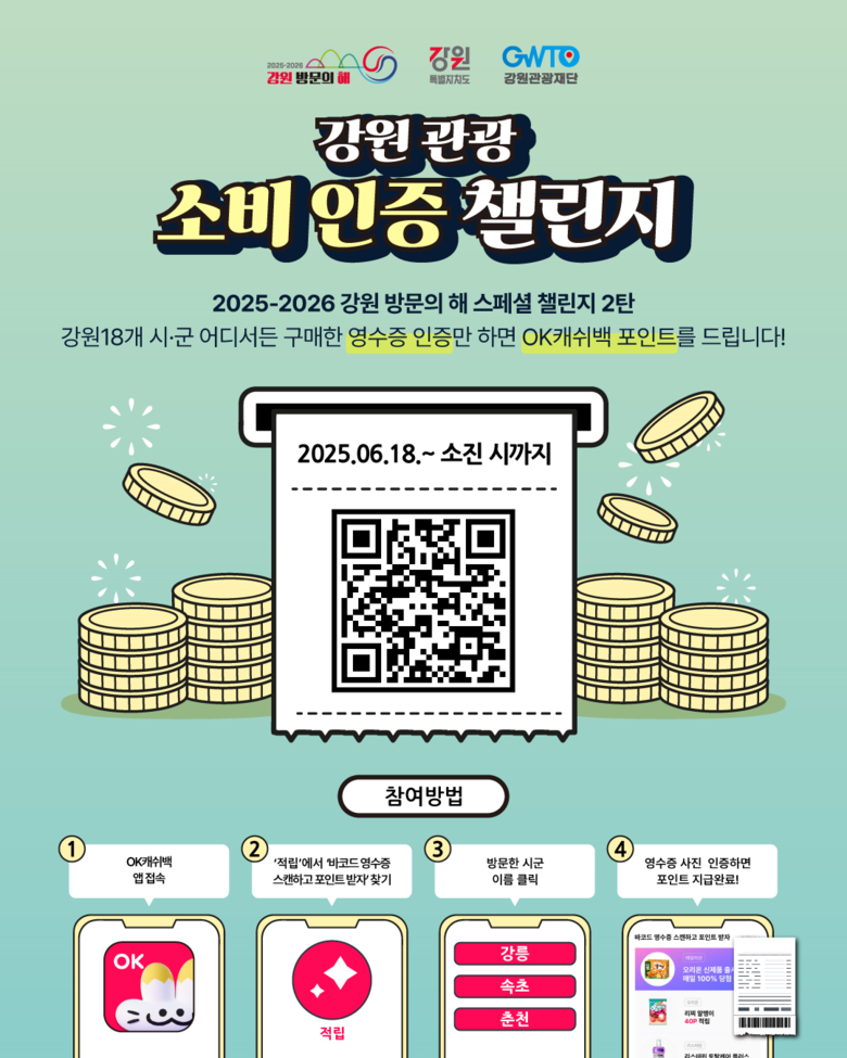 이번 챌린지는 강원특별자치도 내 음식점, 카페는 물론 전통시장에서 발생한 관광 소비 영수증을 인증하면 오케이(OK)캐쉬백 포인트로 환급받을 수 있는 보상형 소비 인증 캠페인이다. 도내 다양한 소비처에서 발생한 영수증을 오케이(OK)캐쉬백 응용 프로그램(애플리케이션)에 인증하면 지역별로 포인트가 자동 적립되는 구조로 관광의 즐거움에 경제적 보상까지 더한 체감형 관광 프로모션이다.