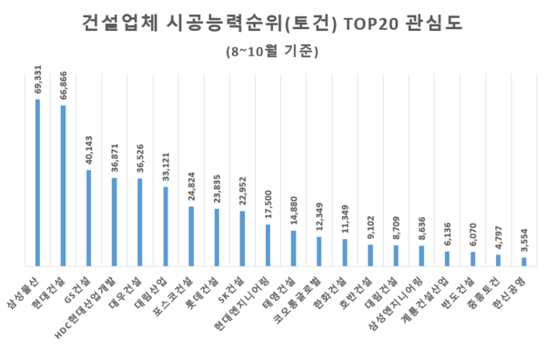 관심도가 가장 낮은 건설업체는 '한신공영'으로 3554건을 기록했다.