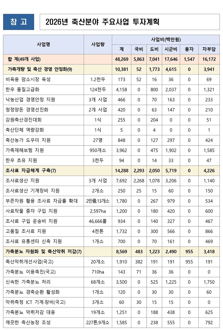 [강원도 세계타임즈=김민석 기자] 강원특별자치도는 스마트·저탄소 축산 전환과 미래 축산 성장동력 확보를 위해 2026년 축산 분야 49개 시책사업에 총 482억 원을 투자한다고 밝혔다.