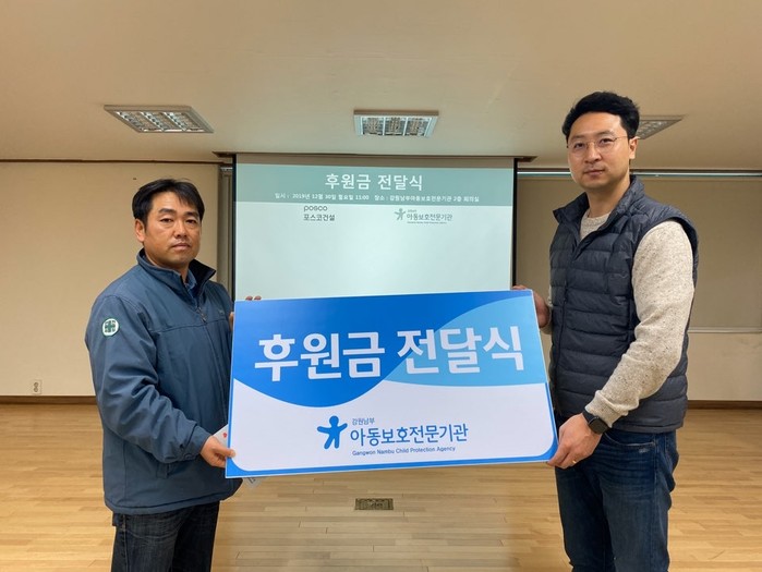 이상욱 강원남부아동보호전문기관장은 “포스코건설 동해항 북방파제 2공구 직원분들의 소중한 나눔에 감사드리며, 학대로 고통받은 모든 아이들의 안전을 위해 강원남부아동보호전문기관이 앞장서겠다”고 말했다.